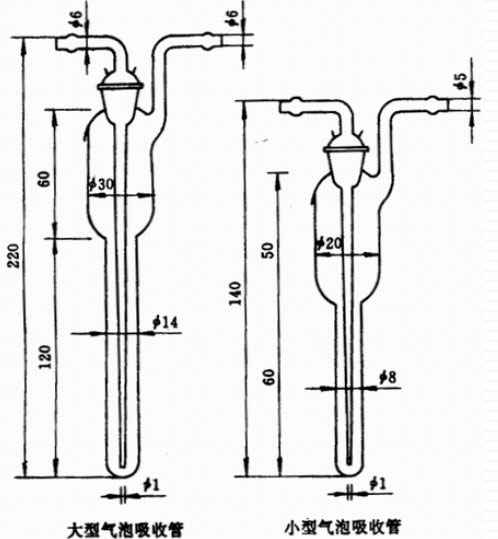 3.4.1规格:分大型气泡吸收管和小型气泡吸收管两种,尺寸见图1。制造用的材料应是硬质玻璃。